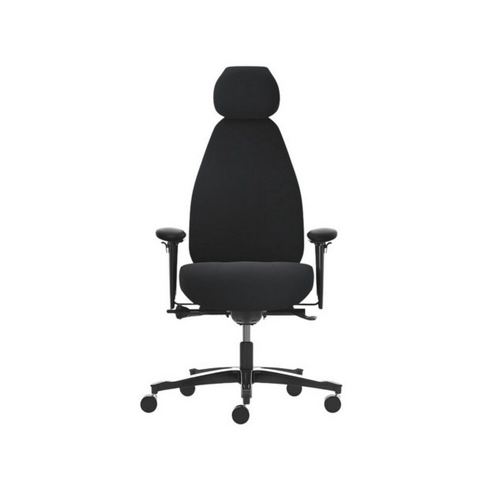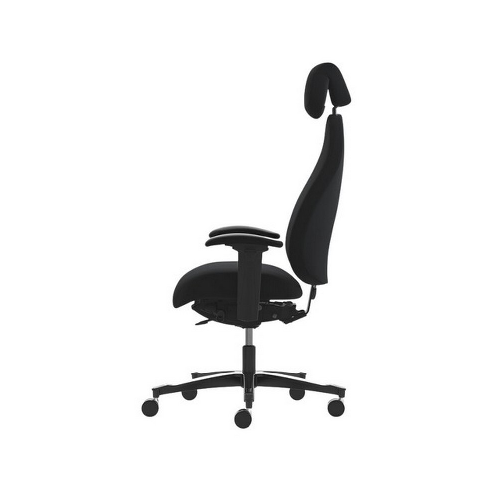 spezial Polsterung und ergonomischen Rücken - Mechanik: Syncro Glide - Hohe Rückenlehne ergonomisch individuell einstellbar durch 4 Gurtbänder - Rückenlehne in Höhe variabel einstellbar (15cm) - Rückenlehnenwinkel einstellbar - mit Beckenstütze - Sitz mit Federkern Pascal by DUX - Sitztiefe einstellbar in 6 Positionen (8cm) - Sitzneigung fließend +15°-- -2° - Mit Nackenstütze stufenlos, individuell anpassbar in 3 Ebenen - Armlehnen drehbar, in Höhe, Breite, Neigung und Tiefe einstellbar Bezug: Select 60999 schwarz Ziernaht: Ohne Armlehne: ErgoFlex Fußkreuz: Alu schwarz Rollen: 6 cm, Weich, schwarz Gasfeder: 2C von 45-54 cm