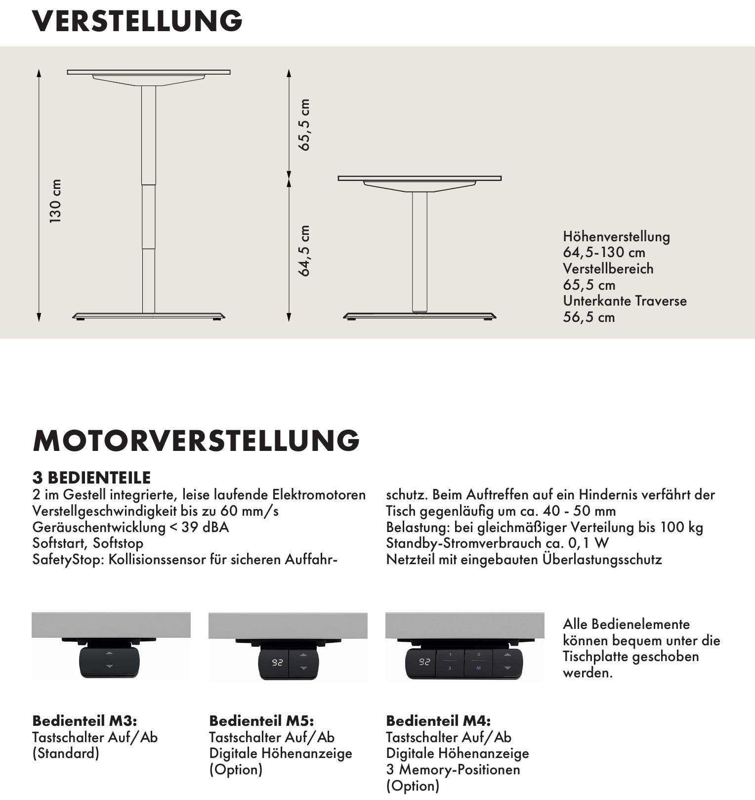 System- motorisch höhenverstellbar von 65-125 cm, Belastung 0-75 kg- Einfachsteuerung mit Up-/Down-Schalter- Tischplatte: - Plattenfarbe: - Gestell: